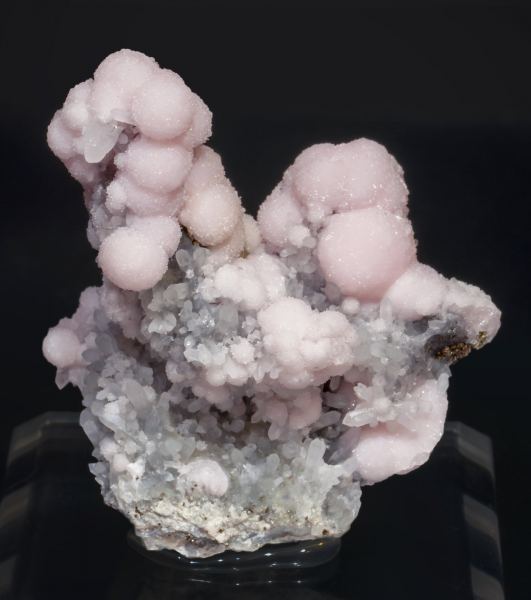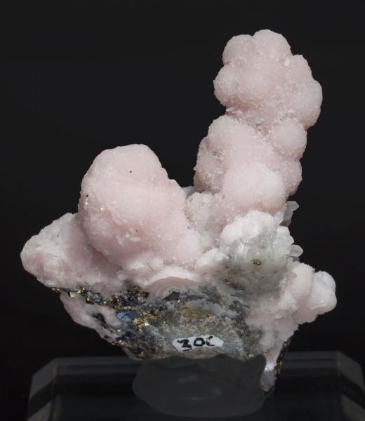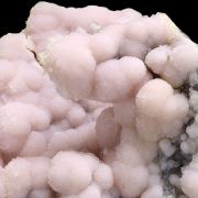 Very aerial growth of botryoidal aggregates of Rhodochrosite crystals on matrix, with Calcite crystals and small Pyrite crystals.Madem-Lakko Mine, Stratoni operations, Cassandra Mines, Chalkidiki Prefecture, Macedonia Department Greece (2010)