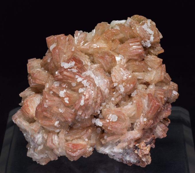 Aggregates of tabular Baryte crystals of variable color, predominantly red due to Hematite inclusions, more intense on the edges. With small white lenticular crystals of Calcite.Mine 18, Paleokamariza Mines, Lavrion Mining District, Attikí (Attica) Prefecture Greece (±1980)