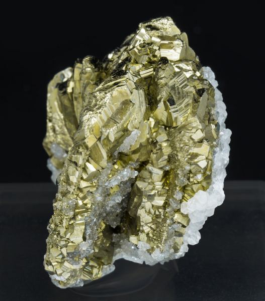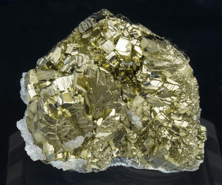 Pyrite crystals with deformed cubic habit, very lustrous, pseudomorphing hexagonal Pyrrhotite crystals and partially coated with small white crystals of Calcite. A fine miniature, very aesthetic and bright.Stan Trg (Stari Trg) Mine, Trepča Complex, Trepča Valley, Kosovska Mitrovica, Kosovska Mitrovica District Kosovo (2010)