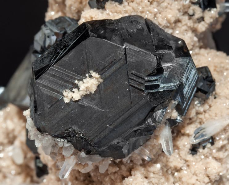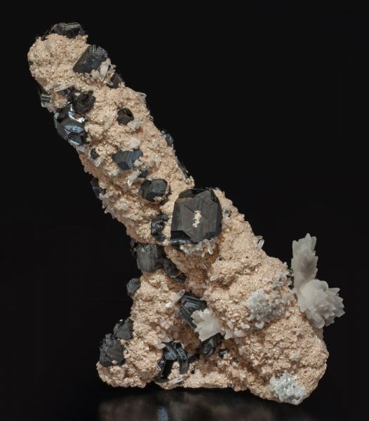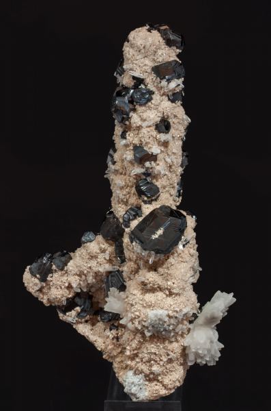 Stalactitic growth of lenticular Rhodochrosite crystals, deep pink, with very individualized twinned Sphalerite crystals, groups of white scalenohedral Calcite crystals and small transparent Quartz crystals, all covering a large Quartz crystal. A splendid classic, very aesthetic.Stan Trg (Stari Trg) Mine, Trepča Complex, Trepča Valley, Kosovska Mitrovica, Kosovska Mitrovica District Kosovo (2002)