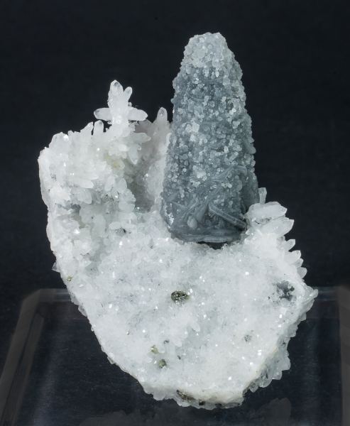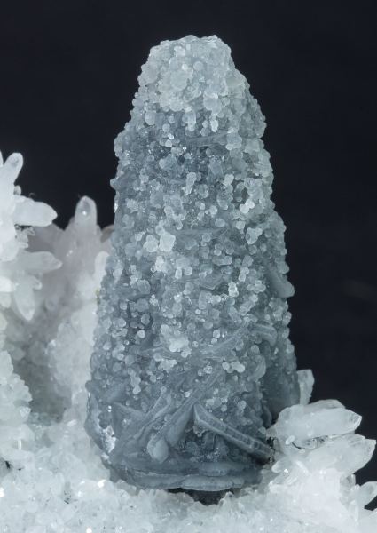 Very acute crystal of Calcite totally covered by a second generation of globular Calcite with gray tones and located very aerially on a matrix of white Quartz crystals. Very original and different from other pieces from this mining district.Boldut Mine, Cavnic mining area, Cavnic, Maramures Romania