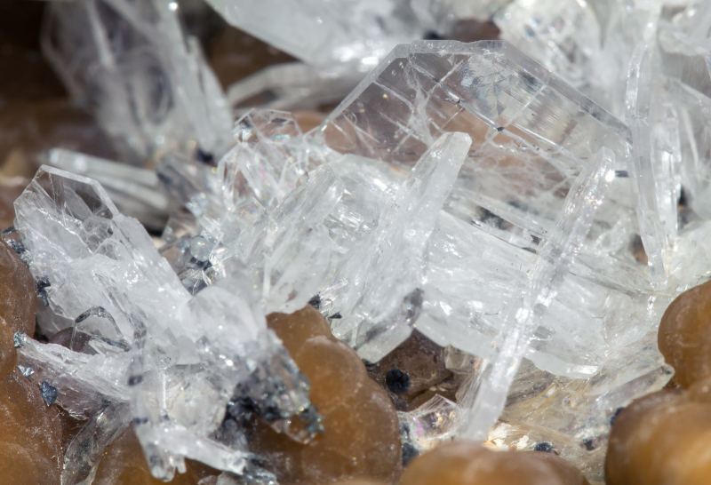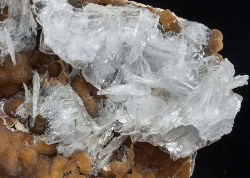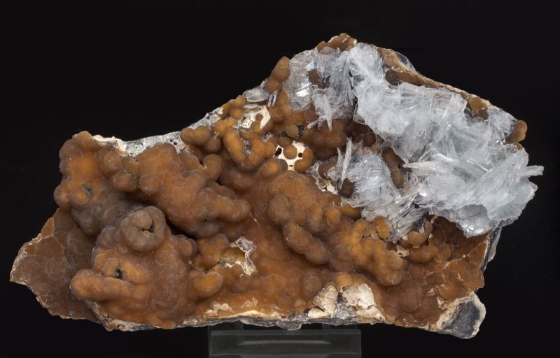 Botryoidal Siderite traditionally well known as sphaerosiderite, on a rocky matrix with bluish and very bright, laminar Baryte crystals.The sample is from the Francesco S. Stoppani collection (catalog number 0635), whose label well send to the buyer. As is the case with so many specimens in this collection, the sample is of great quality for the locality.