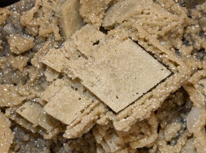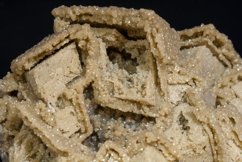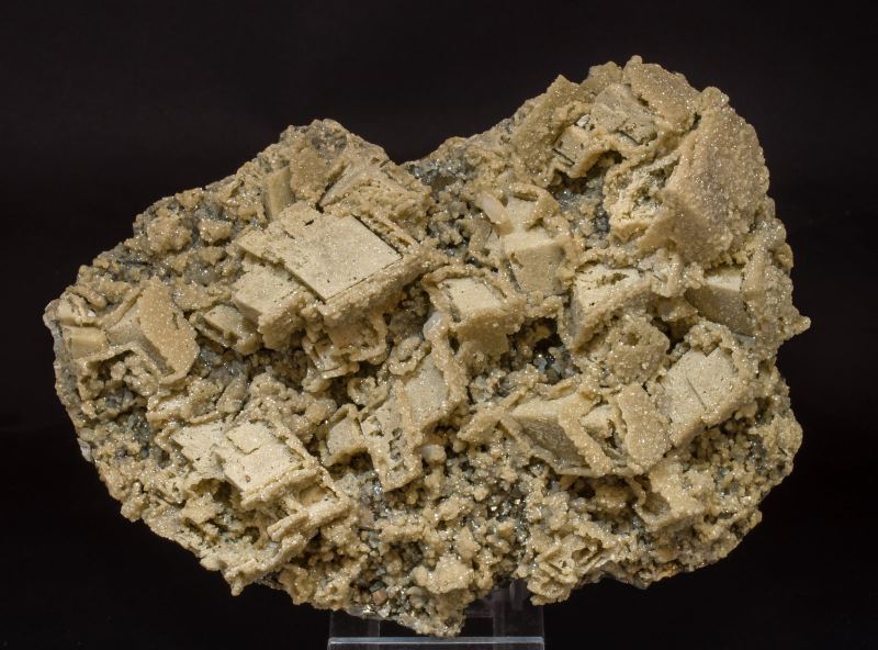Druse of very well defined rhombohedral Siderite crystals which are cast pseudomorphs after Calcite. During the process of the substitution, wall-like external shells were left behind. The siderite casts are on matrix, with small Pyrite crystals.The sample is from the Vallecillo collection, Madrid.