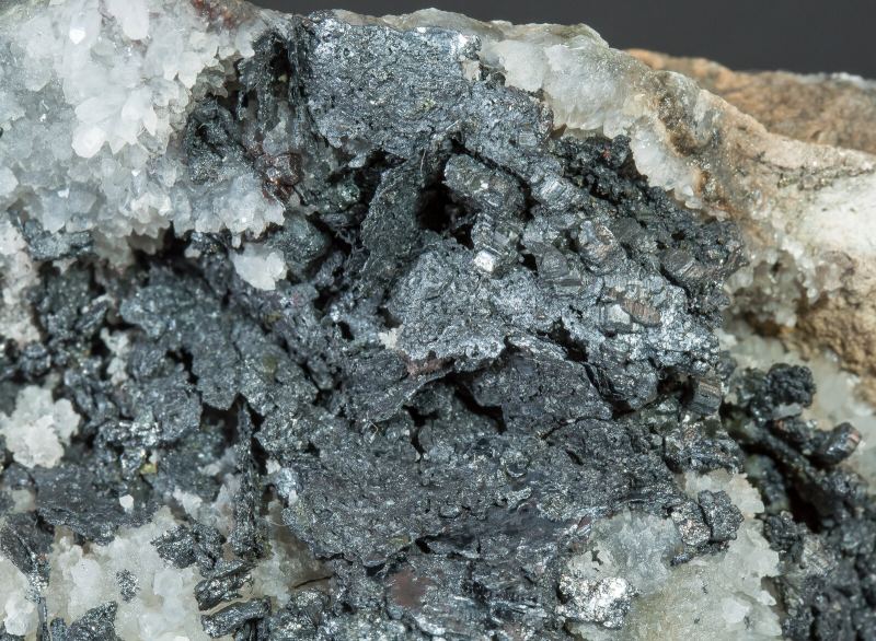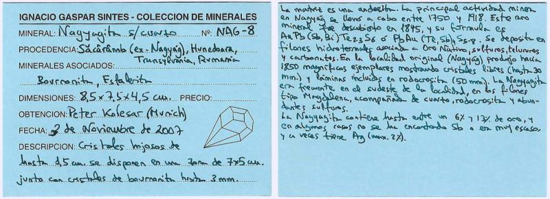 Unusually sharp lamellar crystals of Nagyágite and large for the species, somewhat lustrous, on a Quartz matrix.The specimen, from one of the great classical localities for the species, comes from the Ignacio Gaspar Sintes collection (number NAG-8), whose catalogue entry we will send to the buyer.