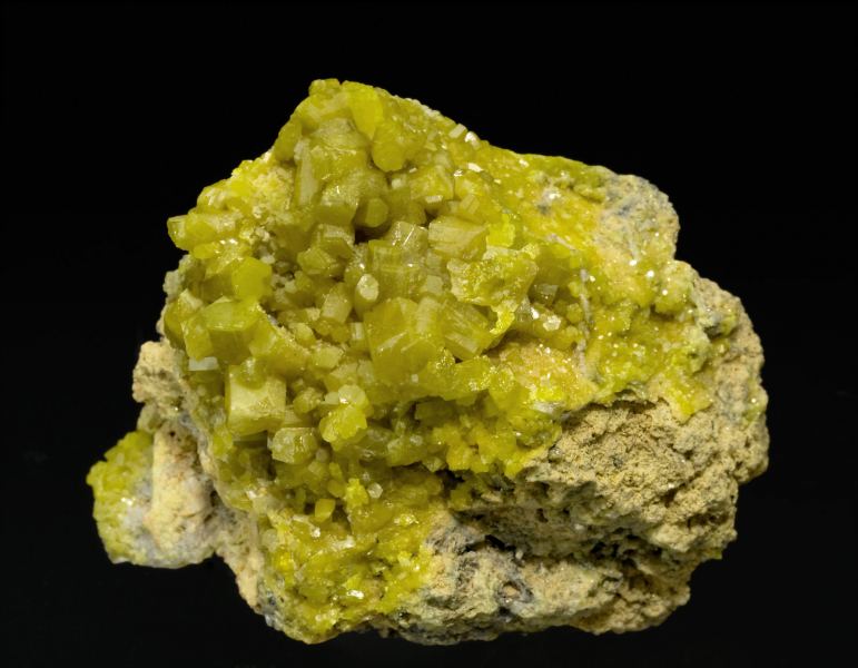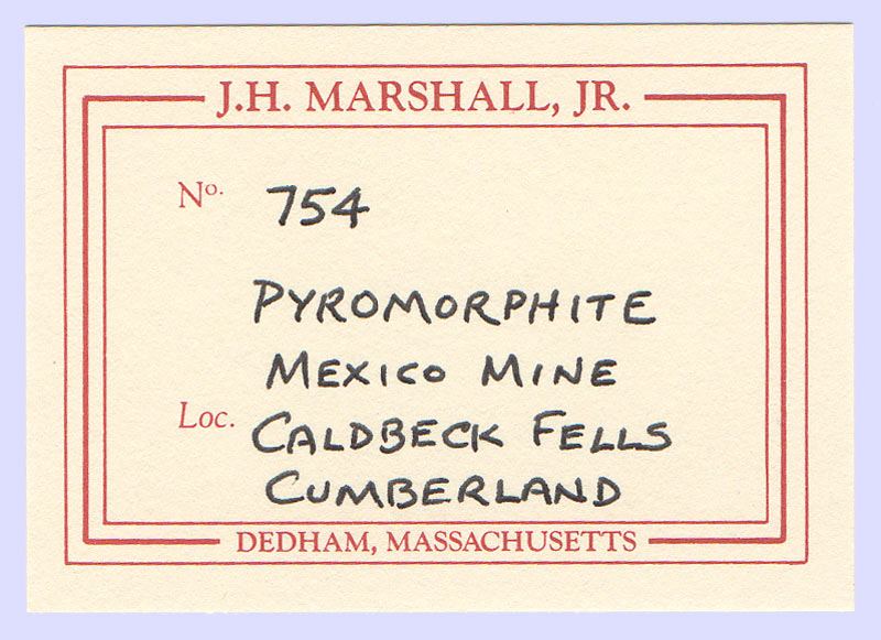 Group on matrix of prismatic crystals with very well defined faces and edges, and a very bright and yellowish green color. Also from one of the great British mineral localities. It is with a label of the well-known collection of John H. Marshall, of Massachusetts, and a catalog card from the same collection.Mexico Mine, Roughton Gill, Caldbeck Fells, Allerdale, former Cumberland, Cumbria England / United Kingdom
