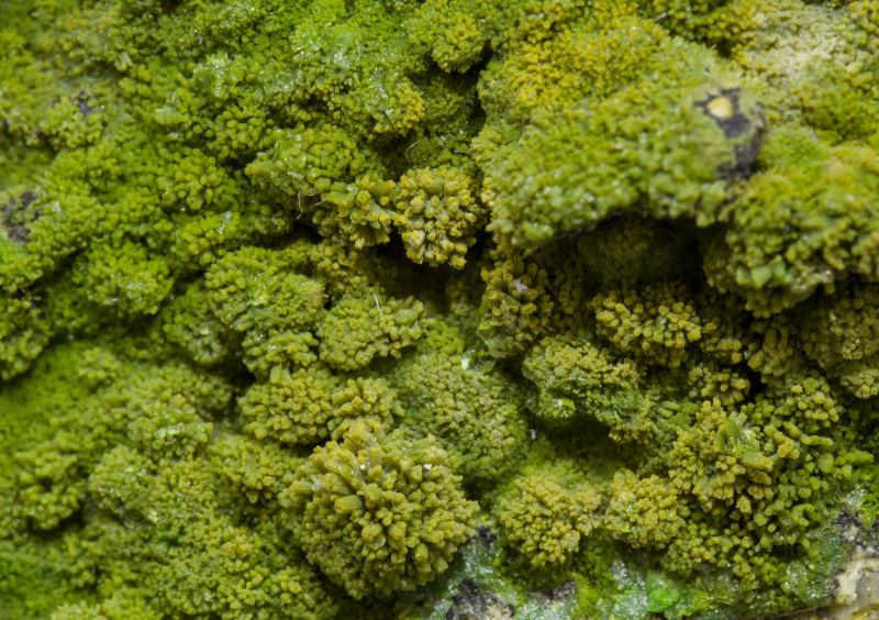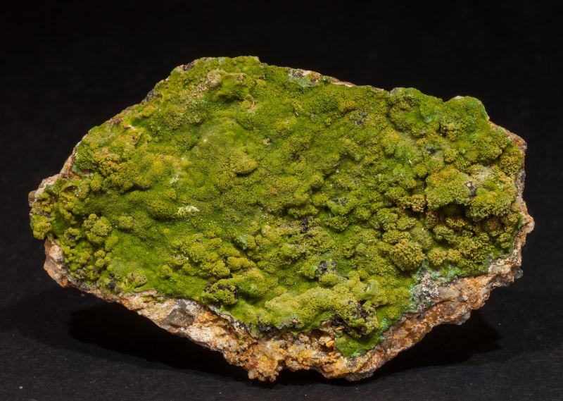 Spheroidal aggregates of small deep green and uniform Pyromorphite crystals, on matrix, with small yellow-brown lamellar crystals of Wulfenite. The specimen comes from one of the classic European localities for the species.Bwlch Glas Mine, Cyneiniog Valley, Talybont, Ceulanymaesmawr, Ceredigion Wales / United Kingdom