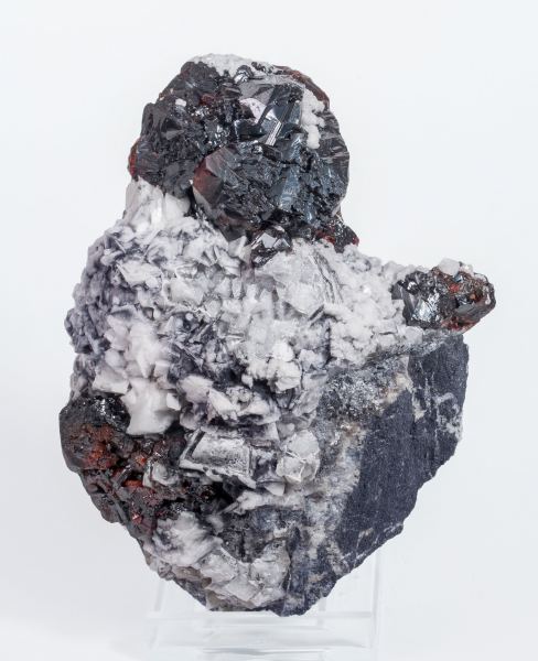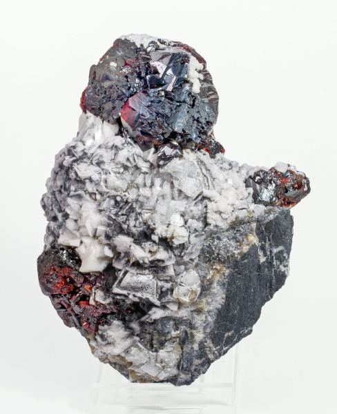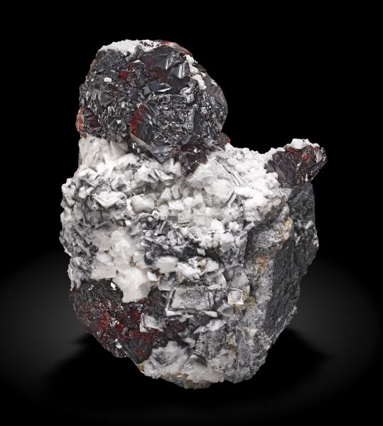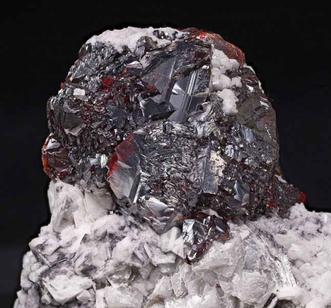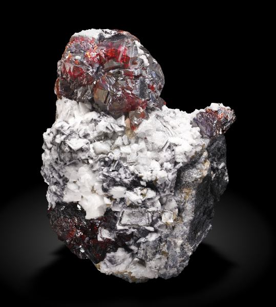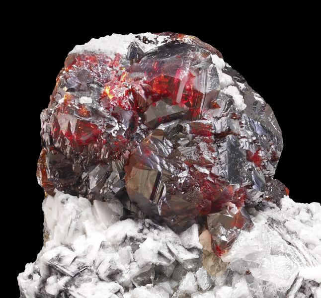 Group of complex Sphalerite crystals, transparent (with back lighting) and lustrous, with an intense color, on a matrix of white rhombohedral Dolomite crystals and small lenticular crystals of light cream colored Siderite. A great French classic with a crystal size bigger than usual in this deposit and with the isolated crystals appearing in very good contrast with the white Dolomite crystals.La Mure coal mines, La Mure, Matheysine-Trièves, Grenoble, Isère, Auvergne-Rhône-Alpes France (±1980)