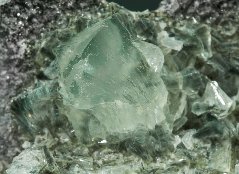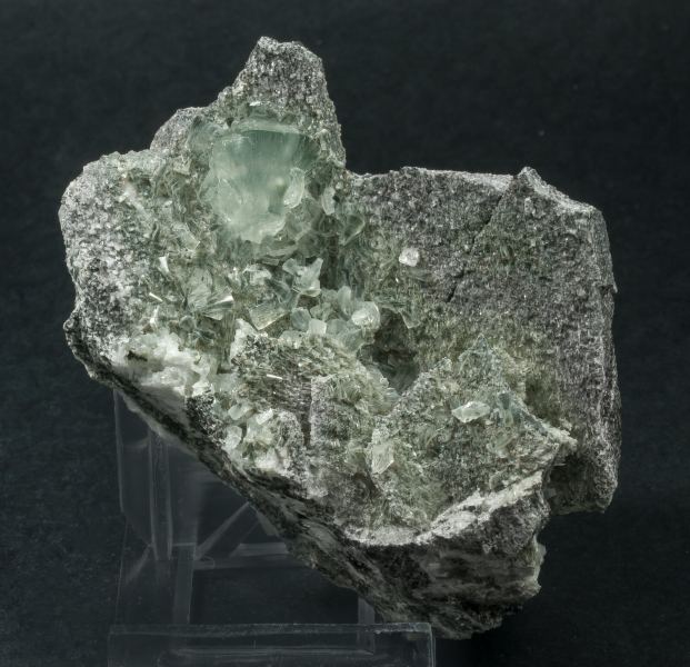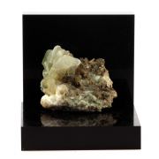 Polycrystalline aggregate of lustrous Prehnite with very well defined faces and edges, and with curvatures, on matrix. It is associated with Epidote and felty aggregates of Actinolite (variety byssolite). Excellent French classic.The specimen comes from the Alain Martaud collection, whose label we will send to the buyer.