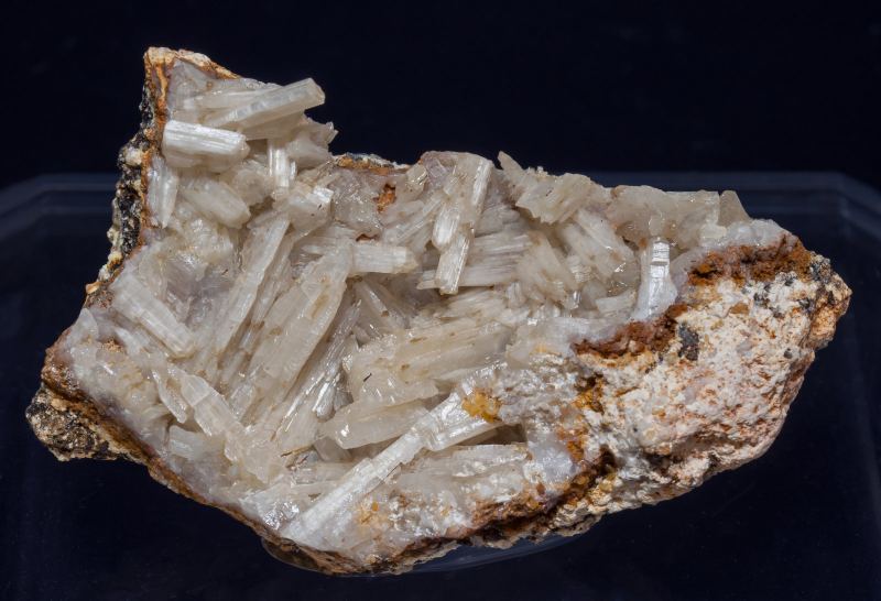 Aggregate on a limonite matrix of white acicular Cerussite crystals with a silky luster and fibrous aspect resembling the so-called jackstraw variety. It is from a locality where samples of such quality are very scarce.Lescure Mine, Mayres, Thueyts, Largentière, Ardèche, Auvergne-Rhône-Alpes France