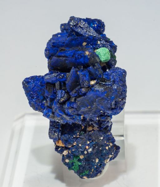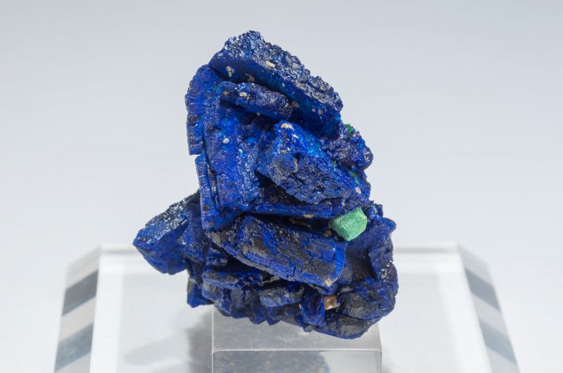 Group of Azurite crystals with very sharp crystal forms and a very vivid color, with Malachite pseudomorphs after Cuprite crystals with the dominant forms of octahedron and dodecahedron. A French classic.Chessy-les-Mines, Les Bois d'Oingt, Villefranche-sur-Saône, Rhône, Auvergne-Rhône-Alpes France