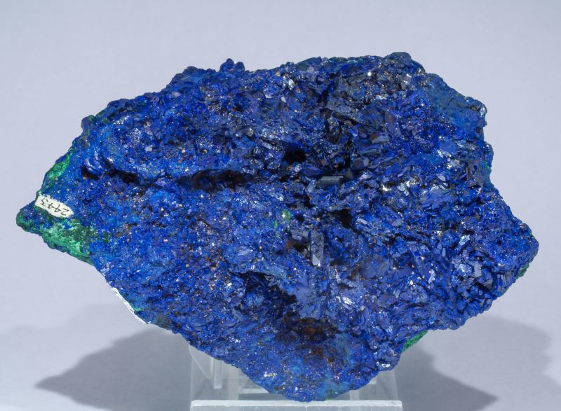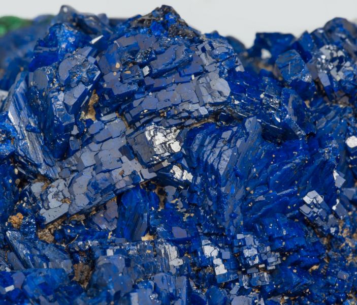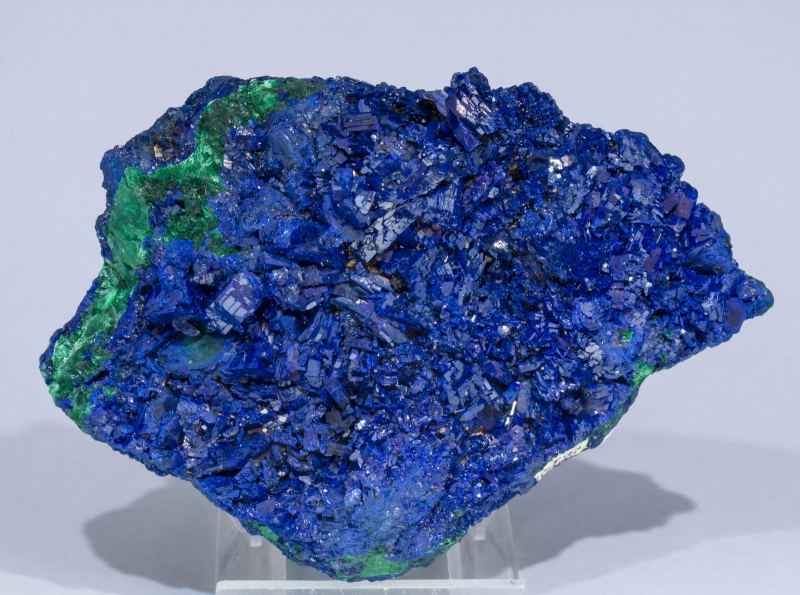 Druse of rhombohedral Azurite crystals with polycrystalline growths and a very vivid color and luster on matrix with fibrous Malachite that has a silky luster. The sample, from a not well-known collection, is very old and has the characteristics of the Azurites that were from the Mine bleue, typical of the XIX century.Chessy-les-Mines, Les Bois d'Oingt, Villefranche-sur-Saône, Rhône, Auvergne-Rhône-Alpes France