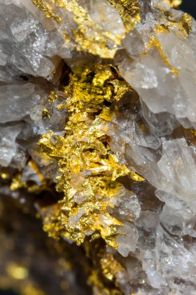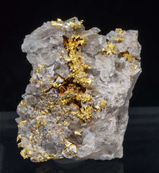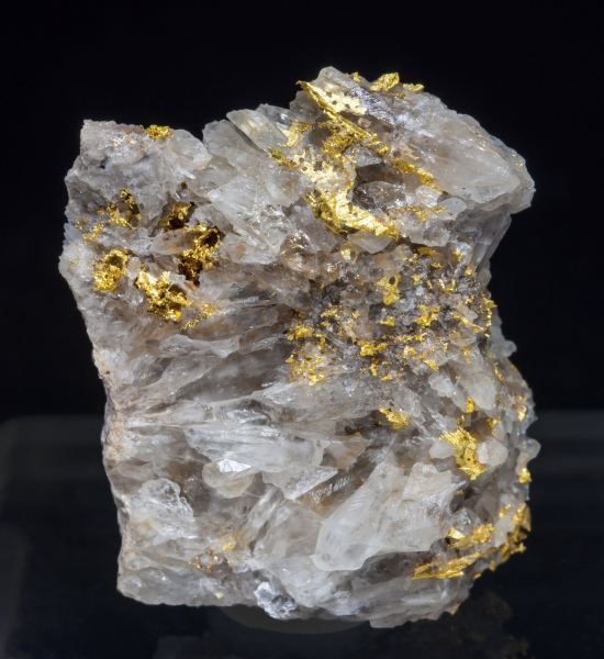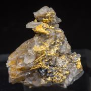 A kind of novelty at Sainte-Marie-aux-Mines 2018, where this Gold appeared to the collectible trade for the first time. It forms very bright laminar growths and coatings on an aggregate of Quartz crystals very much more defined than usual for the locality. The locality, as is usual for a lot of novelties, is approximate and generic, so we are waiting for some more precise data.Loudéac, Saint-Brieuc, Côtes-d'Armor, Brittany/Bretagne France