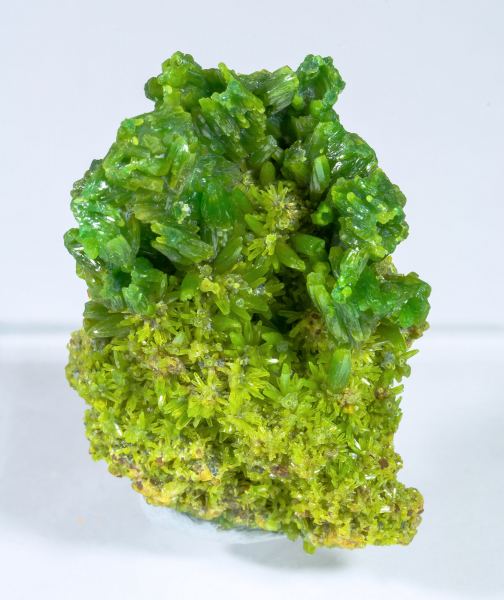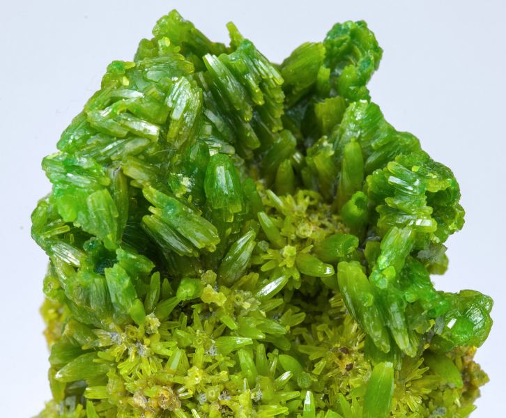 Two generations of Pyromorphite crystals with different habits, one of them with small acicular crystals of a greenish yellow color and the other with thicker and larger crystals, with very well defined faces and edges, many with a hopper termination, intense green and lustrous.Les Farges Mine (Des Farges Mine), Ussel, Corrèze, Nouvelle-Aquitaine France