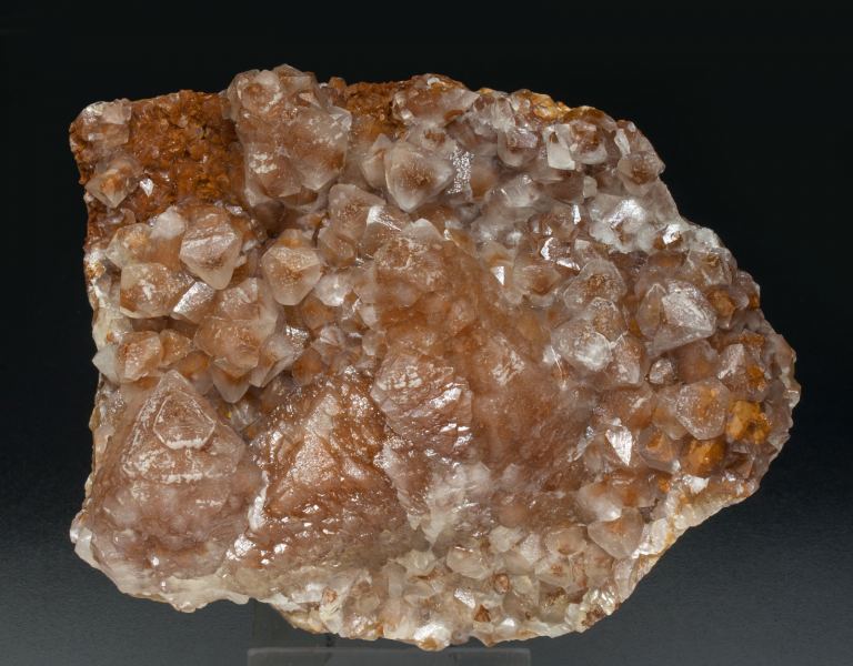 Druse, on a rocky matrix, of crystals showing single prisms and terminal rhombohedra in very well defined parallel growths. The crystals have very well defined color zones due to reddish Hematite inclusions.The sample is with a label from the Stoppani collection that well send to the buyer.