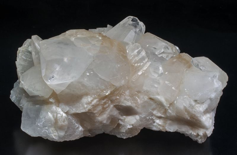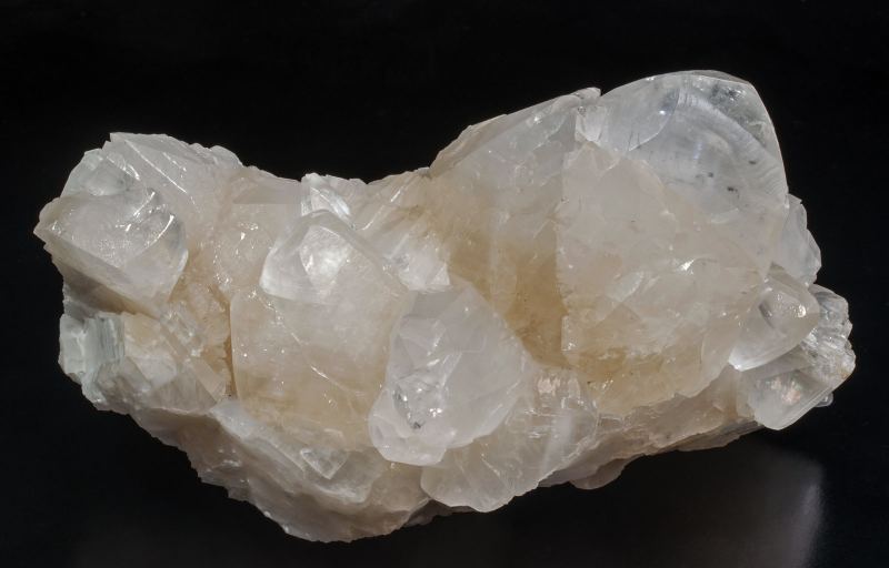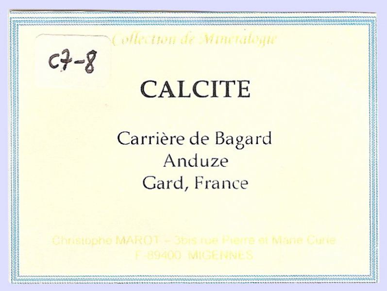 Aggregate of Calcite crystals, very rich with faces and whose length is very much larger than usual for this quarry. The crystals show predominant scalenohedron and rhombohedron forms with slight curvatures on their faces and edges. They are colorless and between translucent and transparent.The sample is from the Christophe Marot collection (cat. nr.. C7-8), whose label well send to the buyer.