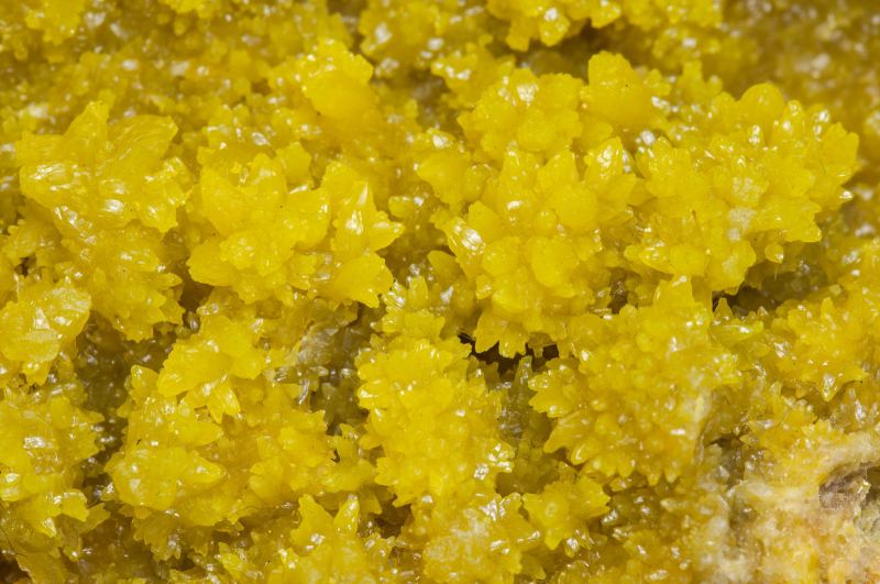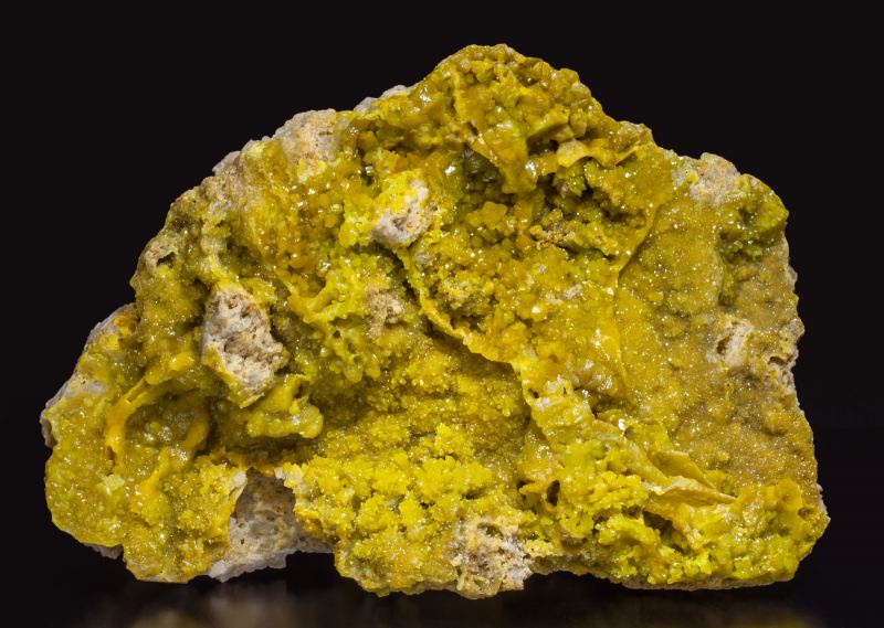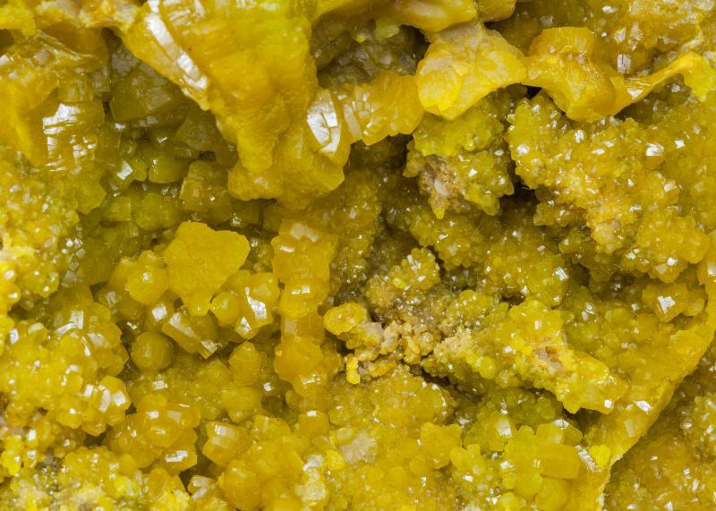 Group of well developed Pyromorphite crystals, with very curved faces and edges, bright greenish yellow, free standing, on a Quartz matrix. The specimen is big for this deposit.La Vidale Mine area, Asprières, Saint-Martin de Bouillac, Aveyron, Occitanie France (05/2017)