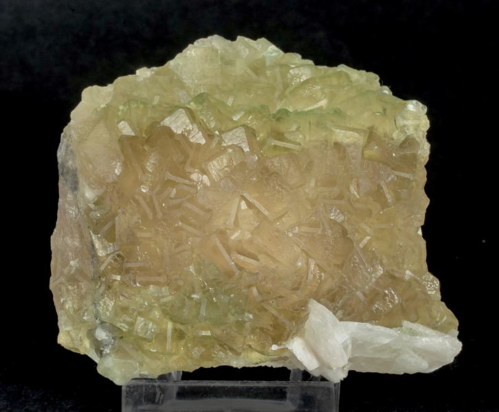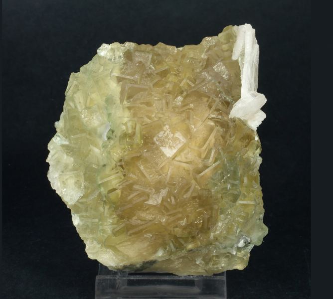 Druse of Fluorite crystals, between transparent and translucent, with a bright luster and an intense and uniform yellow color, associated with a small group of Baryte crystals.A quality French classic that comes from the Alain Martaud collection, whose label we will send to the buyer.