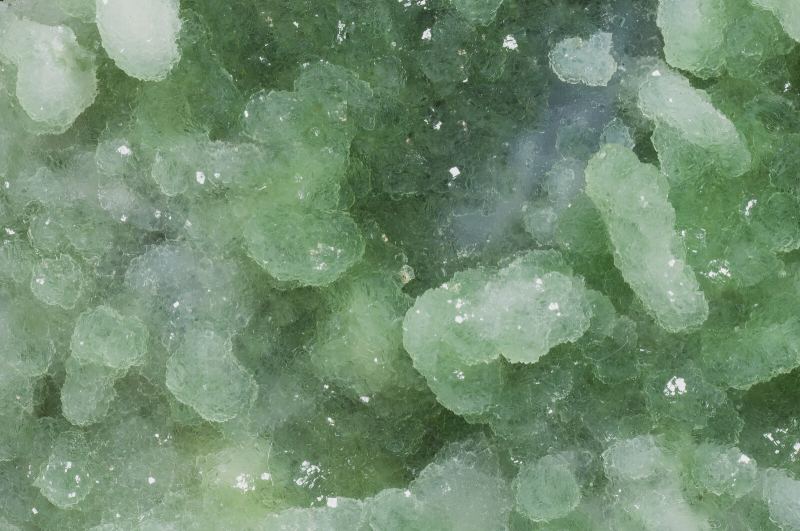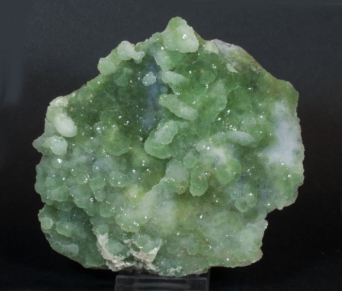 Druse with radial and stalagmitic growths of transparent and bright cubic Fluorite microcrystals with a bright and uniform green color. Unusual combination of stalagmitic growths and the deep green color. Associated with small crystals of Baryte.The specimen is from the Alain Martaud collection.