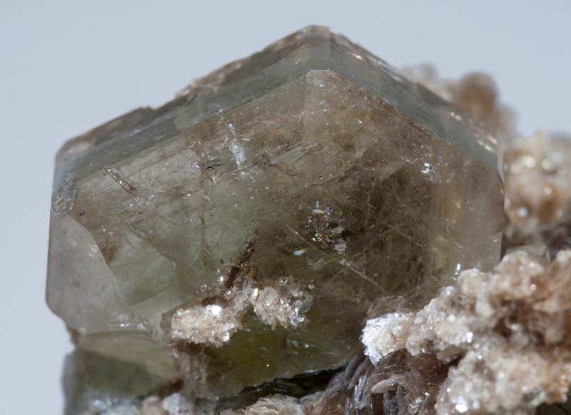 Tabular crystal with a well developed very short prism, the pinacoid and a flat pyramid. It is transparent, very bright with a color between green and golden and its implanted on a rocky matrix with leafy Muscovite aggregates.Minas da Panasqueira, level 0, Aldeia de São Francisco de Assis, Covilhã, Castelo Branco, Cova da Beira, Centro Portugal (08/2015)