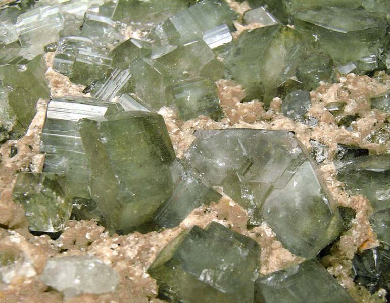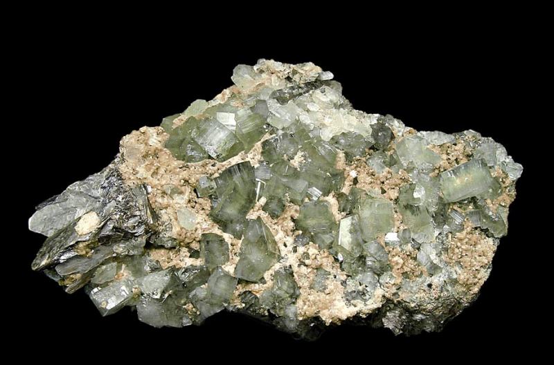 Group of crystals of Fluorapatite, with an attractive pale green color and excellent brilliance, on matrix, with Muscovite and Siderite.Minas da Panasqueira, level 3, Aldeia de São Francisco de Assis, Covilhã, Castelo Branco, Cova da Beira, Centro Portugal (2000)