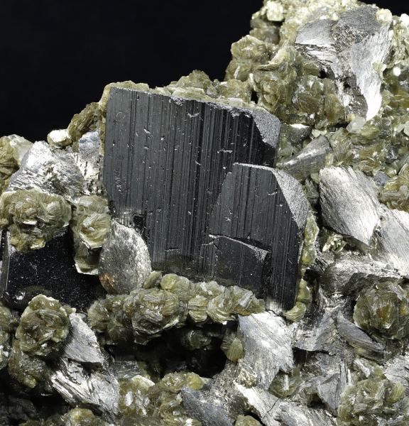 Parallel growth of two very sharp Ferberite crystals on matrix with Arsenopyrite and Quartz crystals and coatings of Muscovite aggregates. Large in size, the piece is more aesthetic than usual due to the contrast of the Ferberite crystals with the Muscovite matrix.Minas da Panasqueira, levels 0-1, Aldeia de São Francisco de Assis, Covilhã, Castelo Branco, Cova da Beira, Centro Portugal (05/2019)