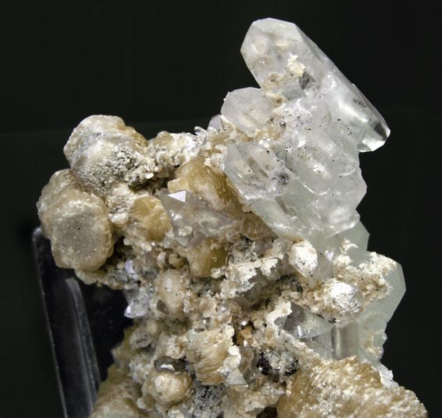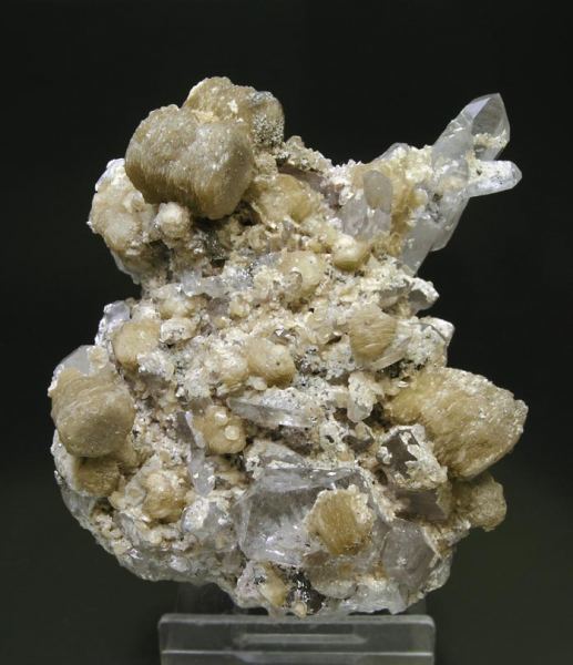 Barrel-shaped crystals of Siderite on a group of Quartz crystals and small crystals of Arsenopyrite and Pyrite.Minas da Panasqueira, level 2, Aldeia de São Francisco de Assis, Covilhã, Castelo Branco, Cova da Beira, Centro Portugal (1997)