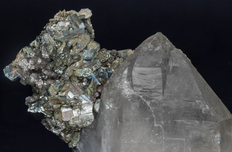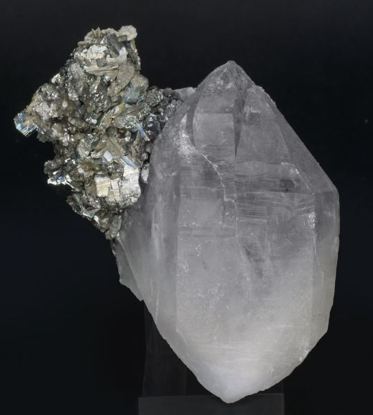 Single Quartz crystal with a very aerial growth of Marcasite-Arsenopyrite, leafy Muscovite growths, and crystals of small lenticular Siderite and white Calcite.Minas da Panasqueira, level 2, Aldeia de São Francisco de Assis, Covilhã, Castelo Branco, Cova da Beira, Centro Portugal (2004)