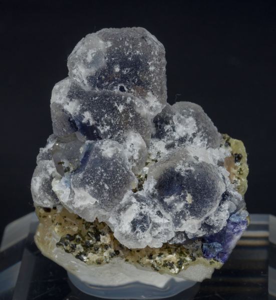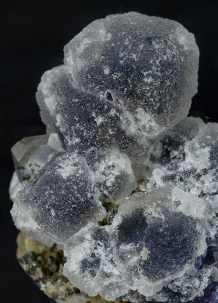 Aggregate of cubic Fluorite crystals beveled by the dodecahedron. They are colorless, with rough faces due to micro-crystalline growths, and have violet phantoms. They are on matrix, with Quartz crystals, Chlorite coatings and small Muscovite aggregates. The upper levels of Panasqueira are currently offering surprising and pleasant novelties, with samples that are very different from what has been known from this mine.Minas da Panasqueira, level 0, Aldeia de São Francisco de Assis, Covilhã, Castelo Branco, Cova da Beira, Centro Portugal (06/2014)