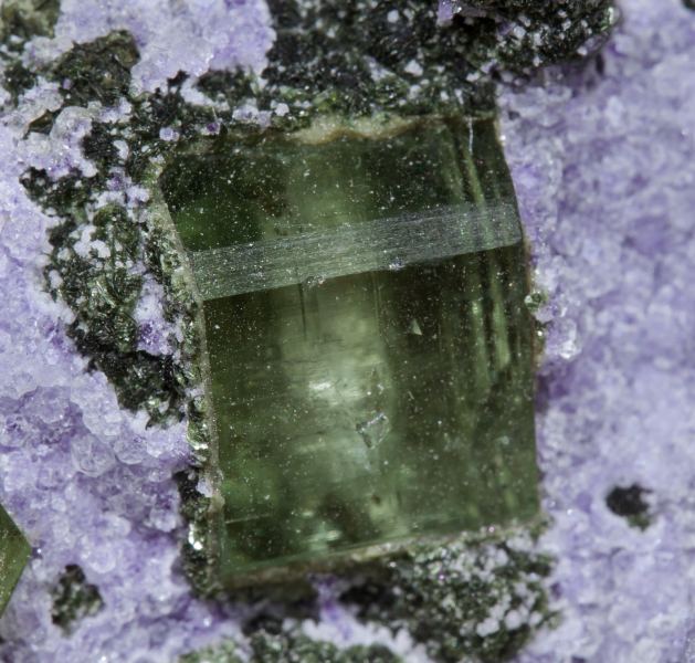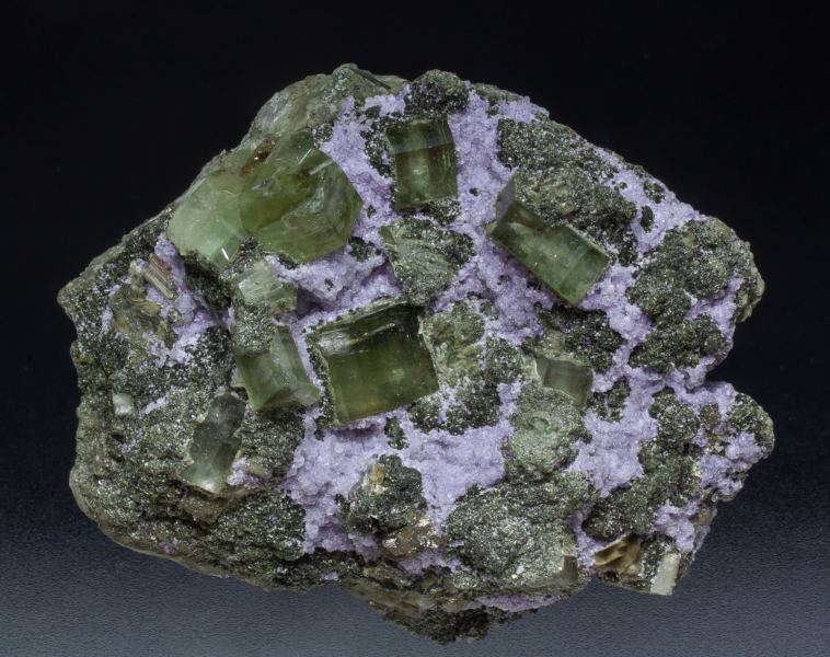 Transparent and very bright thick tabular Fluorapatite crystals with a very deep green color, with small Arsenopyrite crystals and Muscovite aggregates and partially coated by spheroidal Fluorite aggregates with a color between blue and lilac. The upper levels of Panasqueira are currently offering surprising and pleasant novelties, with samples that are very different from what has been known from this mine.Minas da Panasqueira, level 0, Aldeia de São Francisco de Assis, Covilhã, Castelo Branco, Cova da Beira, Centro Portugal (11/2014)