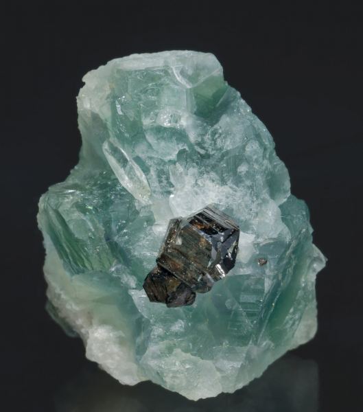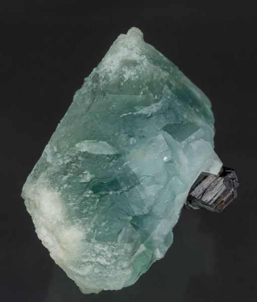 Octahedral crystal, a very rare crystalline form for Fluorite from Panasqueira. It is translucent, with a bluish-green color and white areas on the vertices. There is also a small and very bright group of cyclic Cassiterite twins on the underside of the crystal.Minas da Panasqueira, Aldeia de São Francisco de Assis, Covilhã, Castelo Branco, Cova da Beira, Centro Portugal (1987-2013)