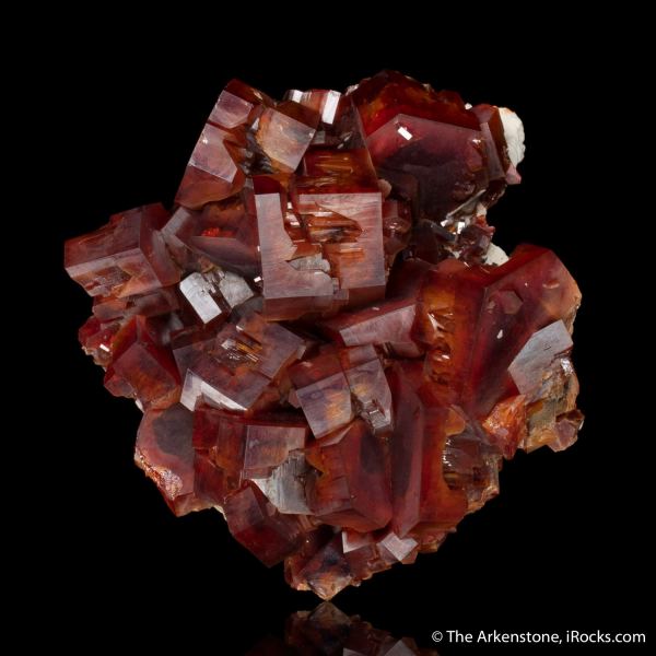 This is a Vanadinite from Mibladen mining district, Midelt Province, Draa-Tafilalet Region, Morocco. These are fantastic crystals of Vanadinite that are actually gemmy orange at the centers and red at the ends, combined with wonderful skeletal and geometric growth patterns.Data last checked on 29th Jul 2024 - specimen may no longer be available