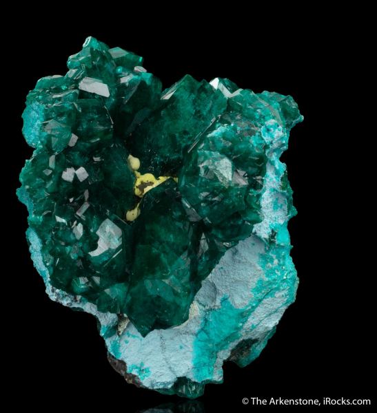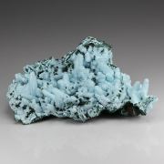 This is a Dioptase with Shattuckite and Chrysocolla from Reneville Mine, Reneville, Kindanba, Pool, Republic of the Congo. Incredibly intense, emerald green, doubly terminated Dioptase crystals, to just over an inch, highlight this handsome small cabinet-sized piece from Reneville in the Republic of the Congo.Data last checked on 29th Jul 2024 - specimen may no longer be available