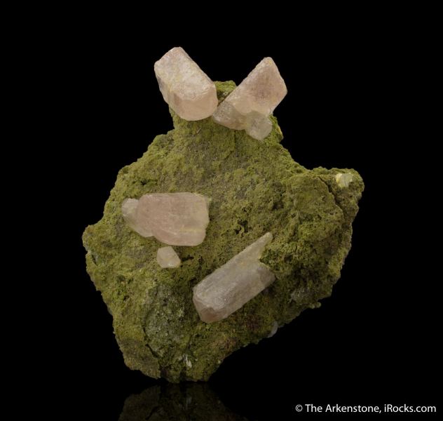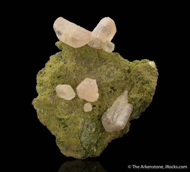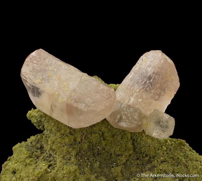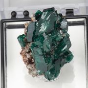 This is a Cerussite on Duftite from Tsumeb Mine, Tsumeb, Oshikoto Region, Namibia. Four large and two small Cerussite crystals are set on a nearly solid matrix of Duftite from the Tsumeb Mine in Namibia, a classic assemblage.Data last checked on 29th Jul 2024 - specimen may no longer be available