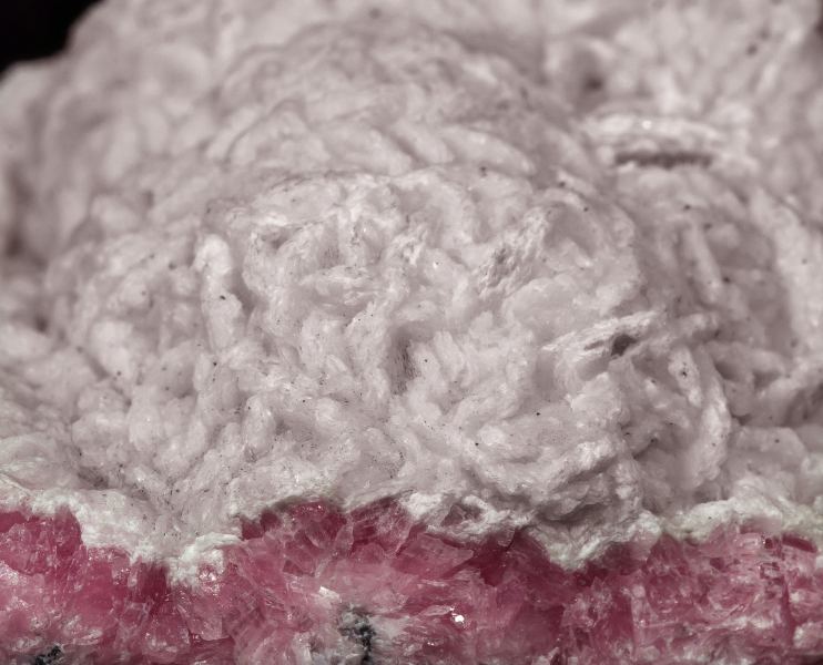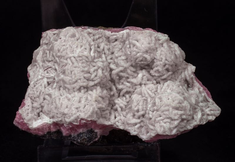 Rich group of Calcite crystals in epitactic growth on Rhodochrosite. The rhodochrosite acted as a substrate which controlled the shapes and orientations of the younger Calcite crystals. The specimen is completed by crystals of Sphalerite which form the matrix, and tiny crystals of Pyrite sprinkled between the white Calcite crystals.Quiruvilca Mine (La Libertad Mine), Quiruvilca District, Santiago de Chuco Province, La Libertad Department Peru (01-02/2016)