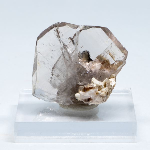 A glassy light smoky quartz Japan law twin from Mina Tiro Estrella. This locality is well known for high quality quartz specimens featuring beautiful striations. The twin is perched on a small matrix of albite crystals. There is some minor chipping.Data last checked on 31st Dec 2021 - specimen may no longer be available