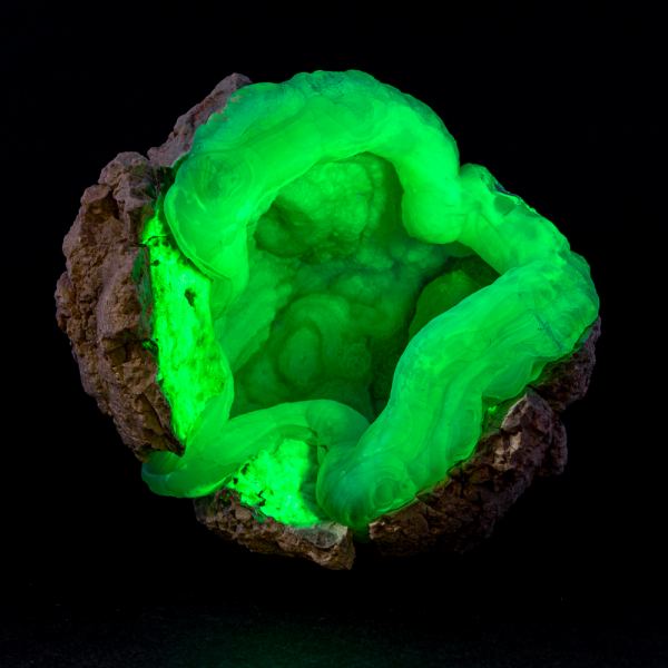 From a new find in Arizona: mounds of botryoidal chalcedony fill the interior of a lithophysae! These specimens are beautifully fluorescent under shortwave light!Data last checked on 31st Dec 2021 - specimen may no longer be available