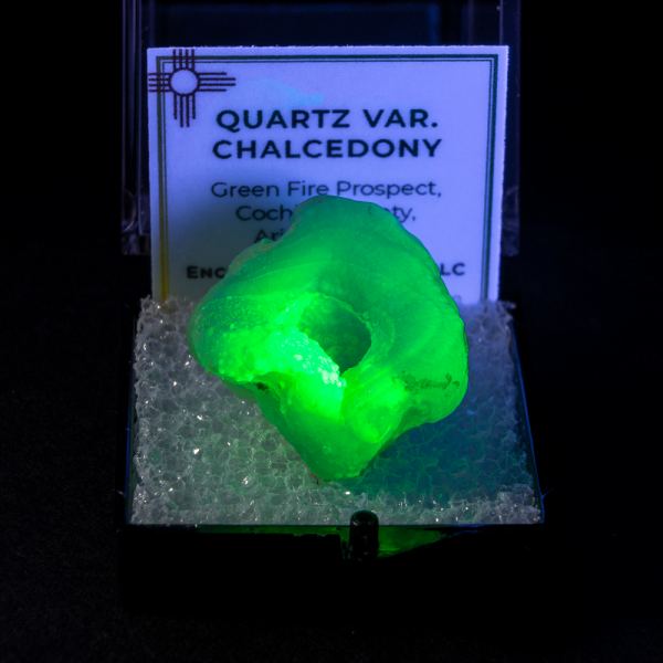 From a new find in Arizona: mounds of botryoidal chalcedony fill the interior of a lithophysae! These specimens are beautifully fluorescent under shortwave light!Data last checked on 31st Dec 2021 - specimen may no longer be available