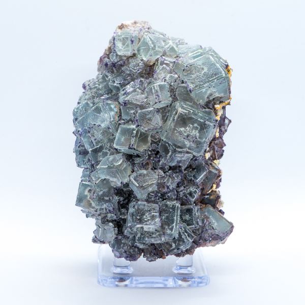 Modified crystals of blue fluorite from the Surprise Mine. The fluorite exhibits a very interesting form with cubes {100} modified by rhombododecahedral faces {110}. In some places, the form is further complicated by a growth interference with a clay that grew preferentially on early rhombododecahedral faces - this has resulted in some edges with 90 degree insets. This particular pocket produced some of the best color in these that has yet been seen. Collected by Phil Simmons and Erin Delventhal, April 2018.Data last checked on 31st Dec 2021 - specimen may no longer be available