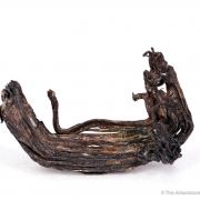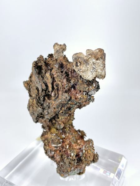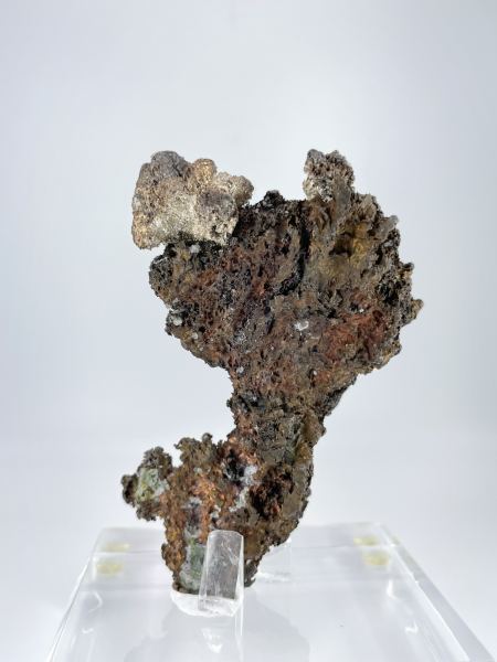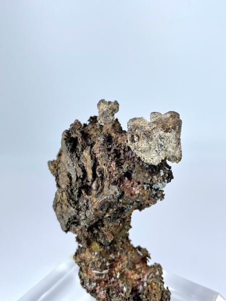 Native silver on copper, the copper is dark in color and crystallized while the silver is a mass of small and rather bright crystals growing in two blobs atop the copper Comes with a custom base.