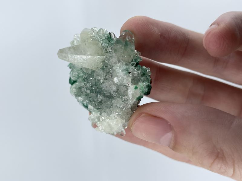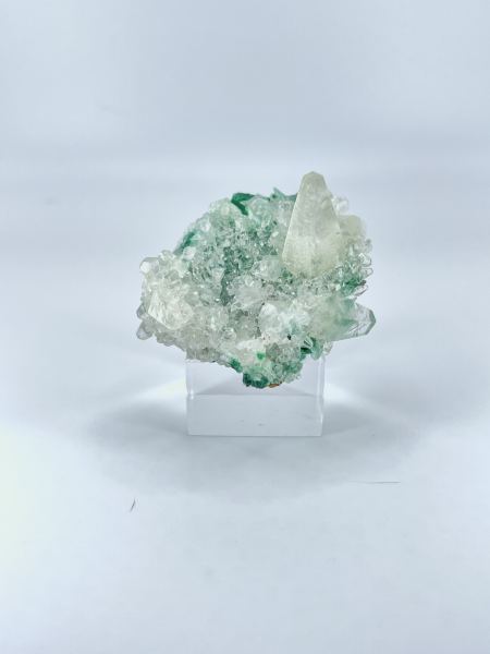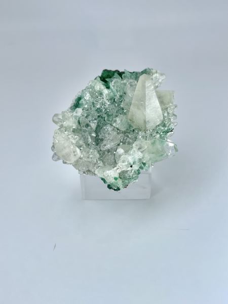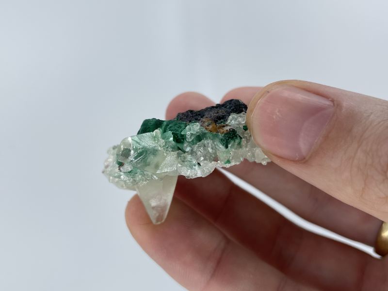 Calcite on malachite, some of the calcite have malachite inclusions. The specimen is in great condition and is a very attractive example of uncommon material. Sacrament Pit, Bisbee, Cochise County, Arizona, USA