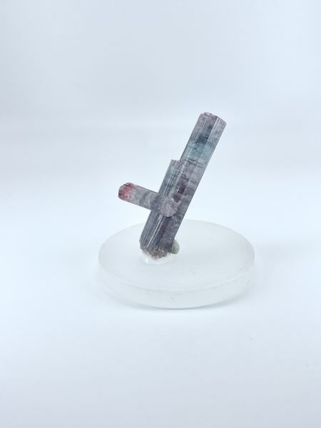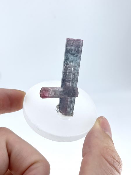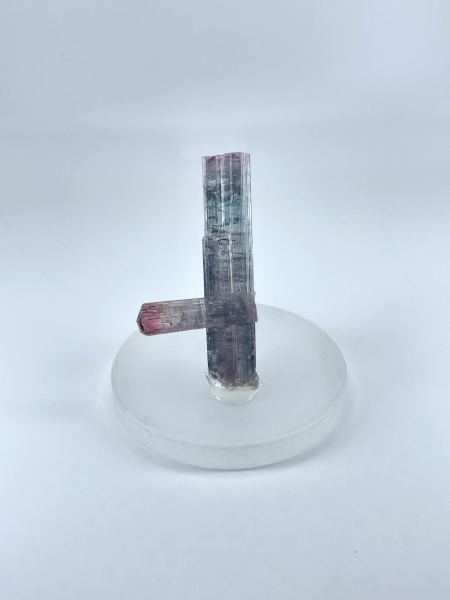 Violet to blue tourmaline with pink caps. The sidecar crystal is terminated on one end the specimen is NOT repaired. Pederneira mine, São José da Safira, Minas Gerais, Brazil
