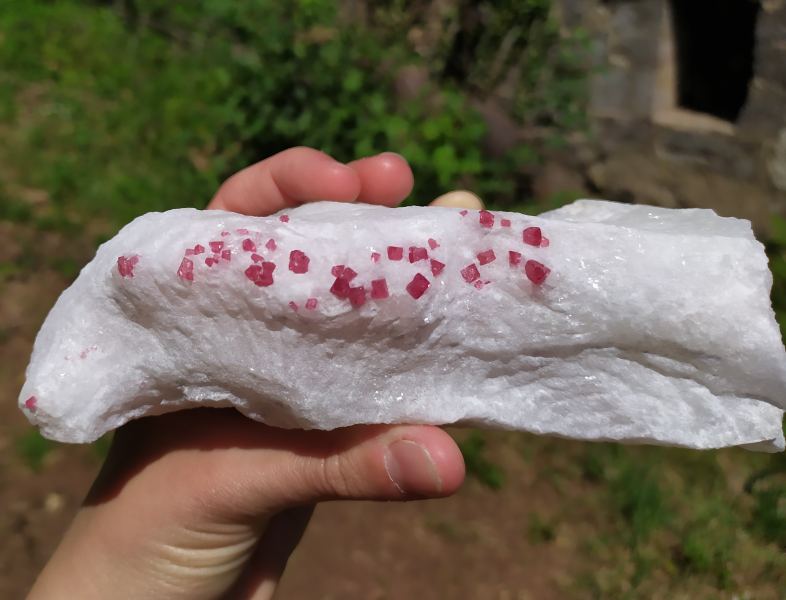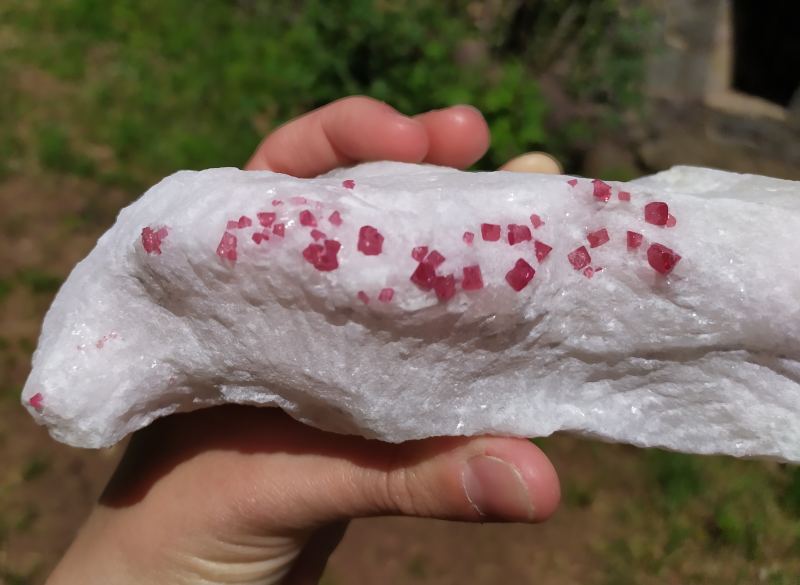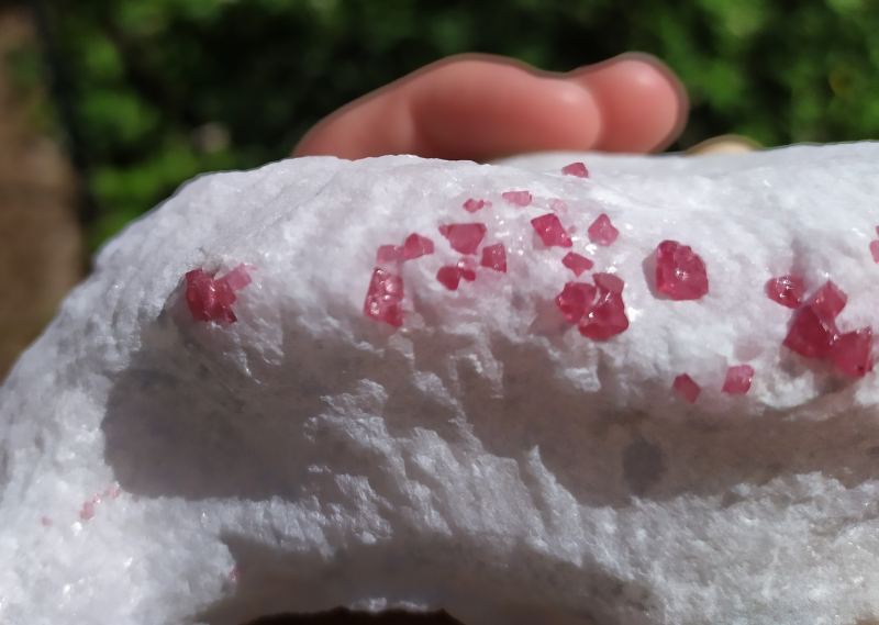 Beautiful contrast of color between the pink spinel and their white calcite gangue.
