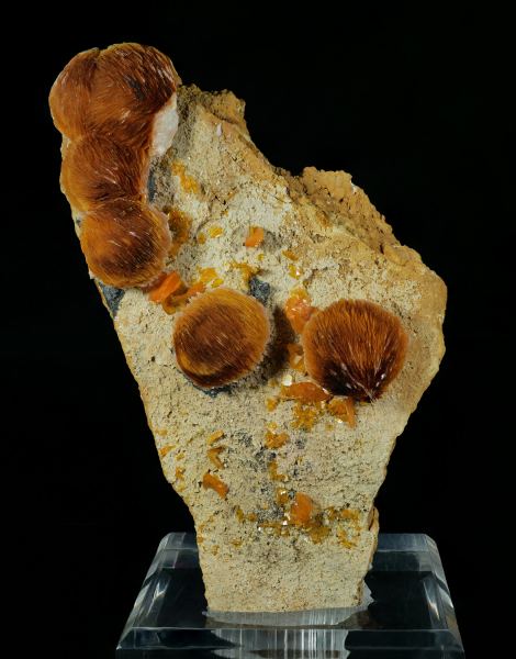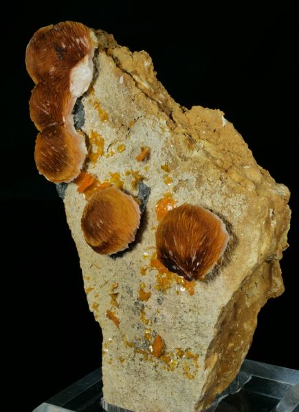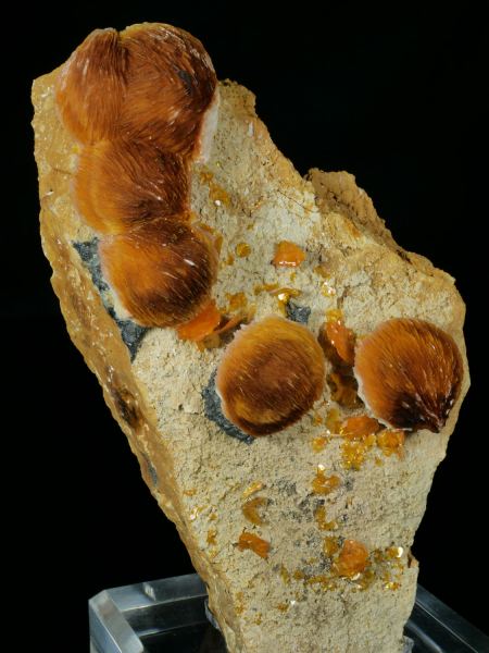 A item for collector with orange Wulfenite crystals and orange Baryte pompoms that remind us of small hedgehogs. This piece is highlighted by its custom base realized by us.