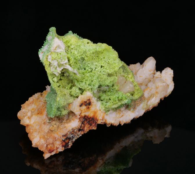 Superb specimen of Pyromorphite from China associated with the Cerussite including a crystal twinned on Pyromorphite. This piece has a beautiful shiny apple green. Beautiful quality of crystallization.