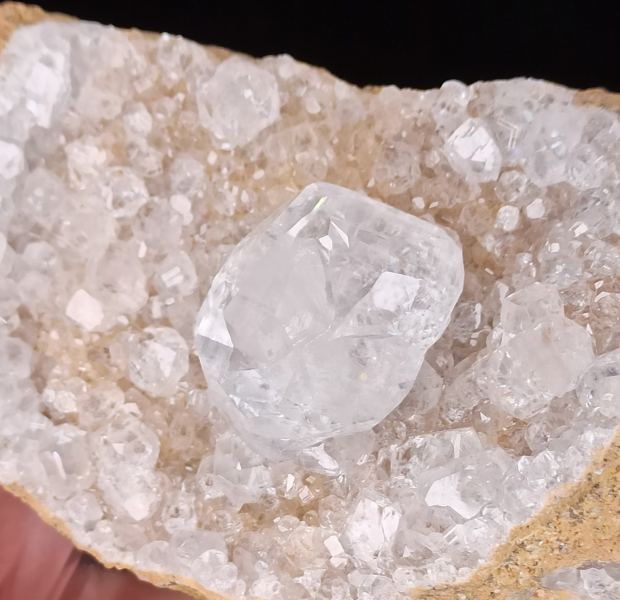 Superb Calcite from Pau in France having a main crystal 2.70 x 2.80 x 2.20 cm. Beautiful gloss and transparency for its crystals.