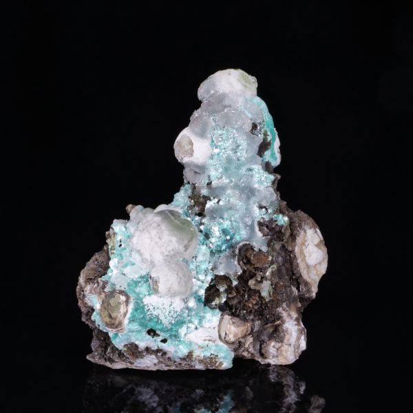 Superb specimen Rosasite on Hemimorphite from Mine 79 in the United States. Sold with original label 79 Mine.
