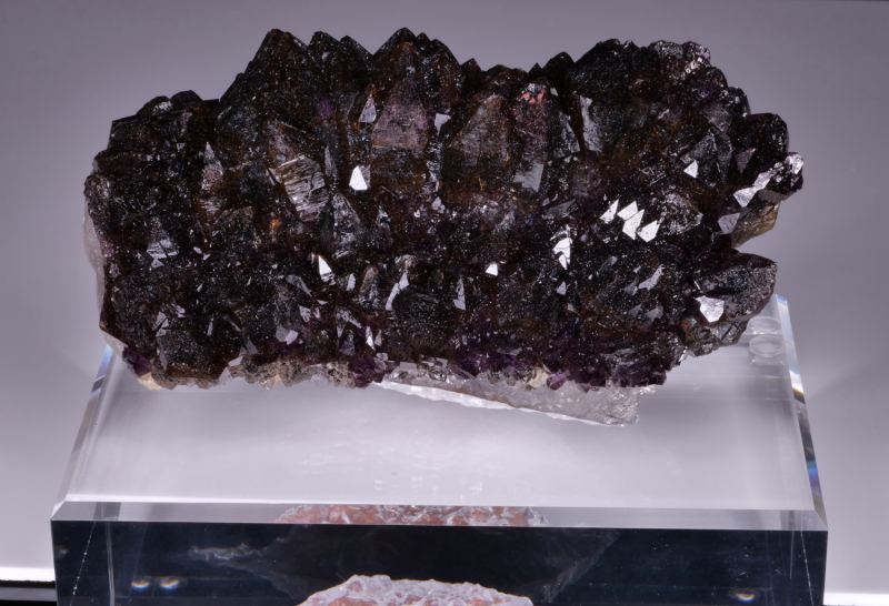 Superb piece of Amethyst from Karur India. This crystal group group is huge and have lots of crystals very well trained, almost smoked and included hematite that gives them this violet very dark color. The crystals are very dark across the top, in the center are intense violet and Quartz at the base. This piece is beautifully enhanced by our base to measure.