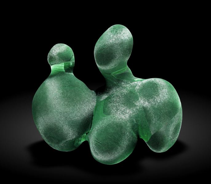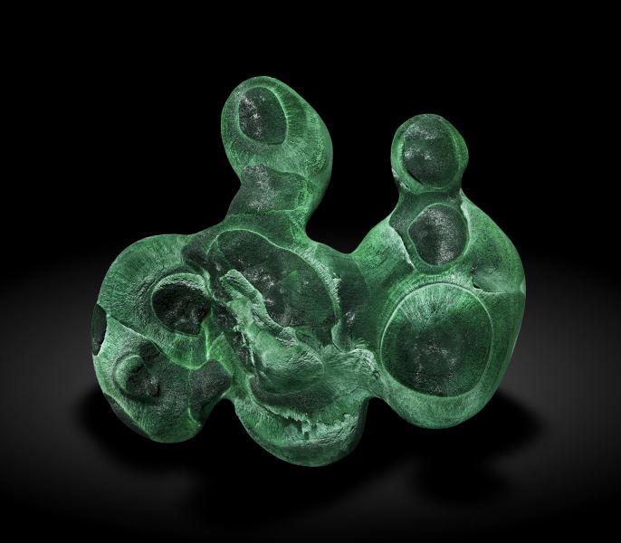 Botryoidal growths of very aesthetic Malachite shapes, with bands of different shades of green and an intense silky luster, which gives it a peculiar 'chatoyant' appearance.This particular piece features a pareidolia phenomenon, simulating a group of human figures (or a pair of joined water bottles)