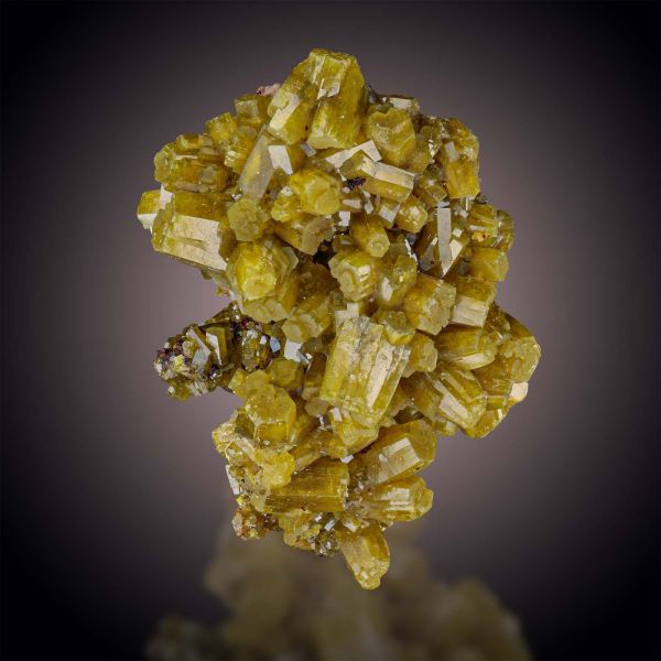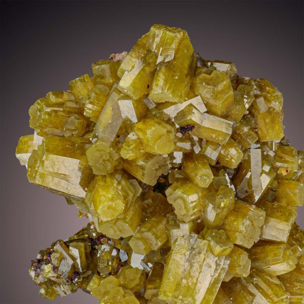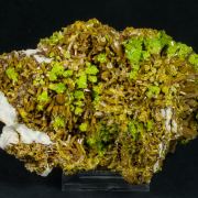 This is a stunning mini, featuring numerous of excellent defined and slightly barrel-shaped crystals of Pyromorphite on minor, gossan matrix. The single crystals are highly lustrous, sharp edged and excellent, partly multifaced terminated. A superb specimen from the heydays of this great mine near Bad Ems.Data last checked on 31st Dec 2021 - specimen may no longer be available