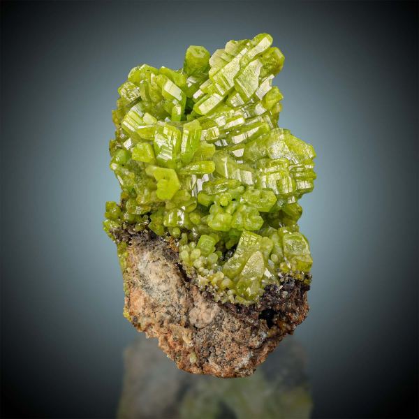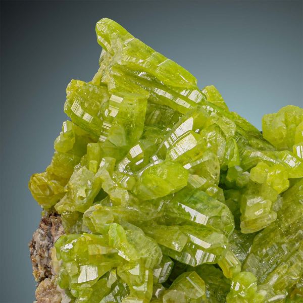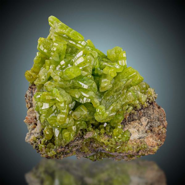 This is a superb specimen of well defined intense acid green Pyromorphite, richly set on matrix. The Pyromorphite is highly lustrous, razor sharp and excellent terminated with a clearly visible hopper growing. This is a great Pyromorphite specimen, almost pristine and for highest demands, considering balance, blaze of colour, integrity of the display side and overall aesthetic.Data last checked on 31st Dec 2021 - specimen may no longer be available